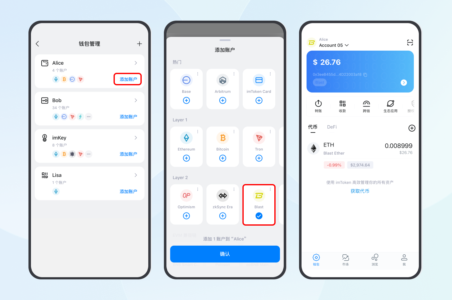 以 imToken 为例,首先下载安装 imToken 并创建 / 导入钱包,并勾选添加 Blast 账户。下载链接:https://token.im