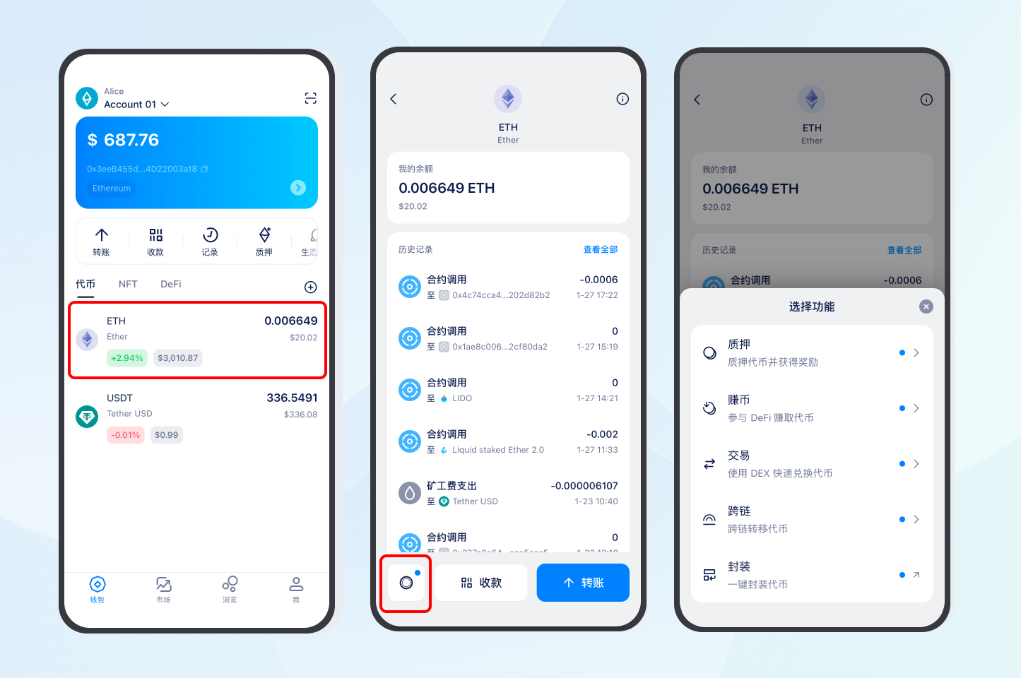 3. 功能列表:在这里,你会看到该代币相关的常用功能。imToken 已为你筛选了各功能下的主流应用,涵盖了质押、赚币、跨链、交易、封装等,助你一站式开启生态体验。