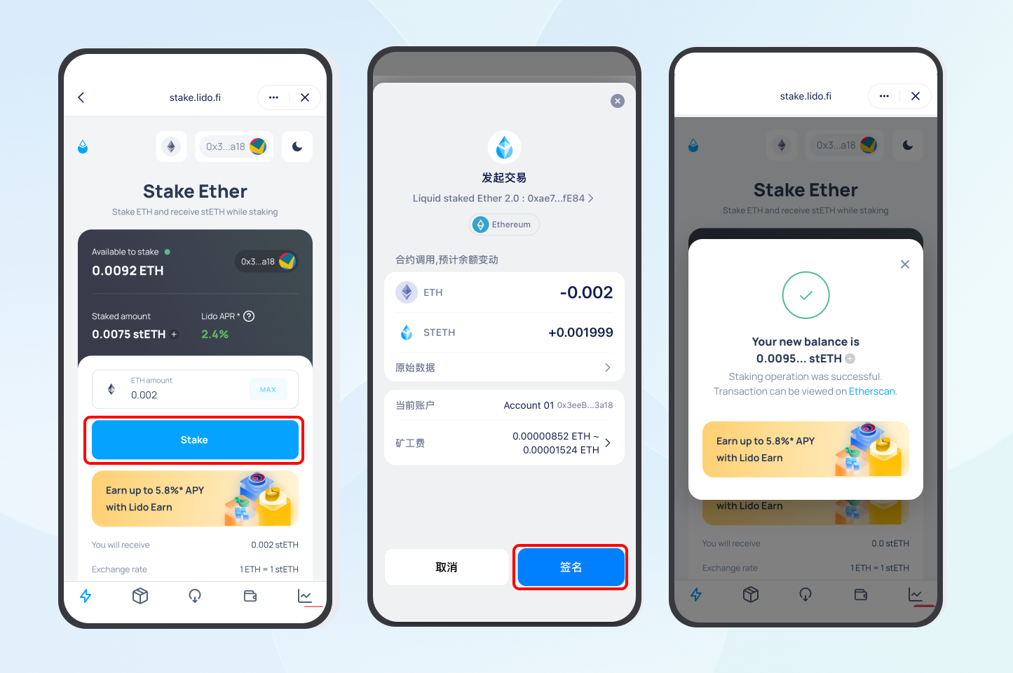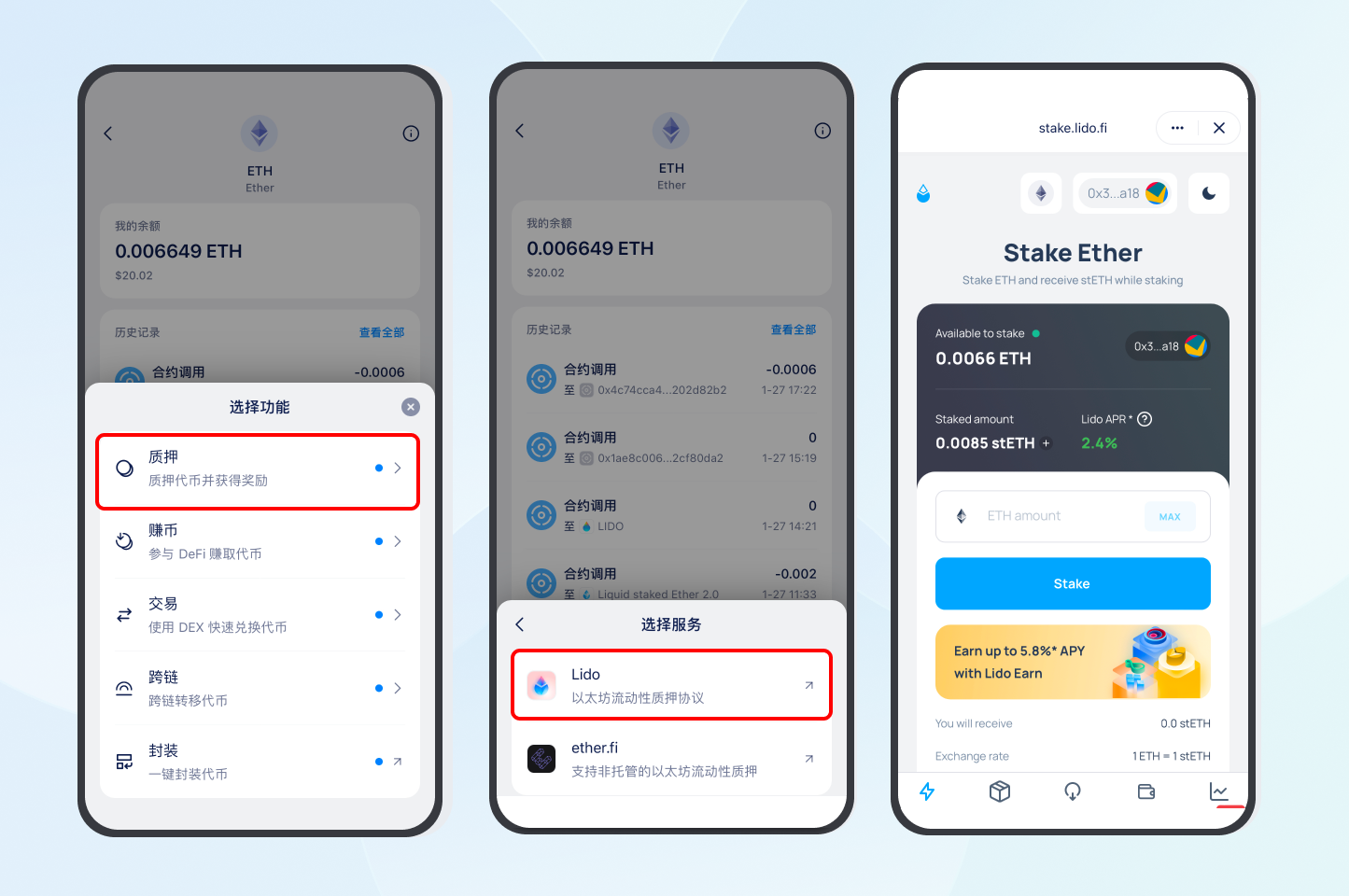 💡 为什么选择 Lido? 传统质押有 32 ETH 的高门槛且需锁仓。通过 Lido,你可以任意 ETH 起步,并获得 stETH 凭证。它代表了你的质押权益,且能在生态内流通,捕获更多收益机会。点此了解更多