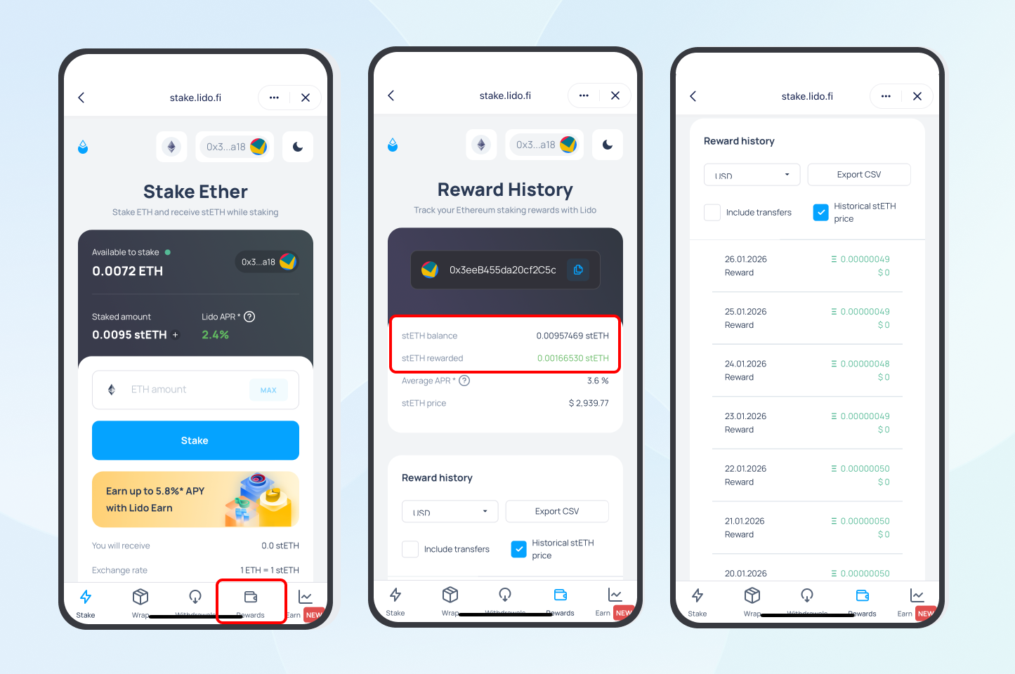 - 查看 stETH Balance(余额): 包含你存入的 ETH 本金 + 以太坊网络奖励给你的 ETH 金额(stETH rewarded)。stETH 金额在该页面会每日自动更新。