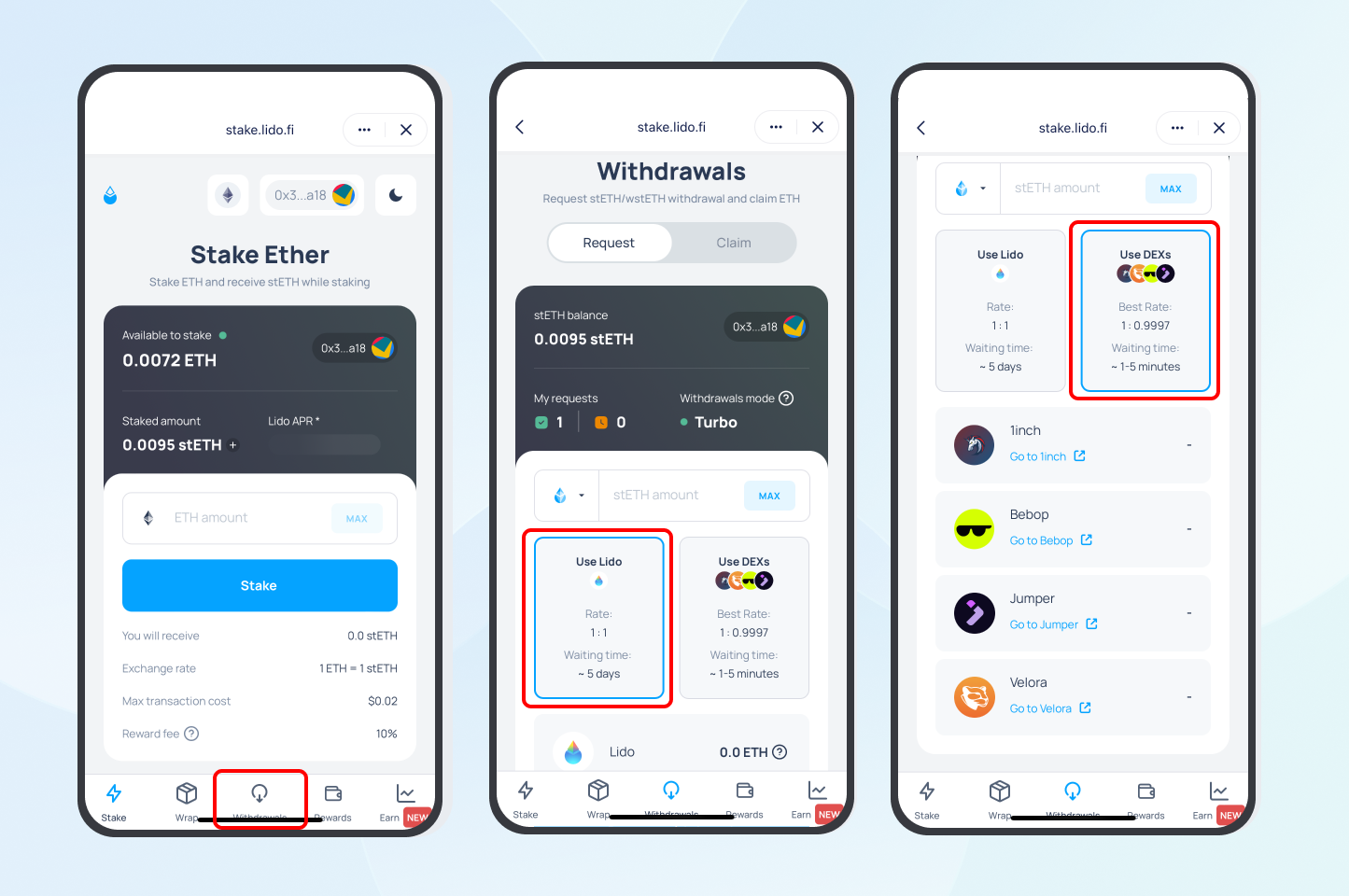 - 操作: 你可以通过 1inch、Jumper 等去中心化交易平台(DEX)直接将 stETH 换回 ETH。