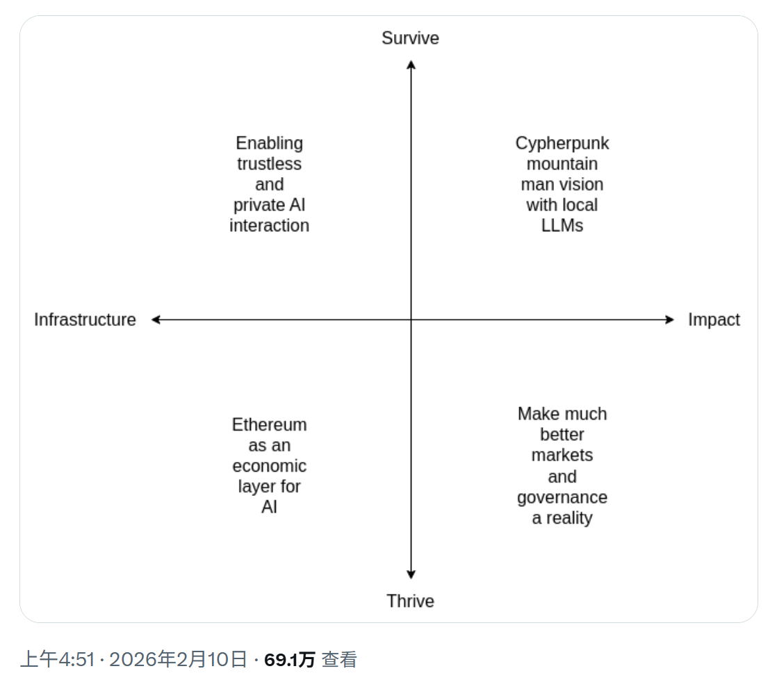 2026 年 2 月,Vitalik Buterin 在 X 上发布一篇系统性帖子,专门修订了他两年前提出的「加密 × AI」交叉框架。