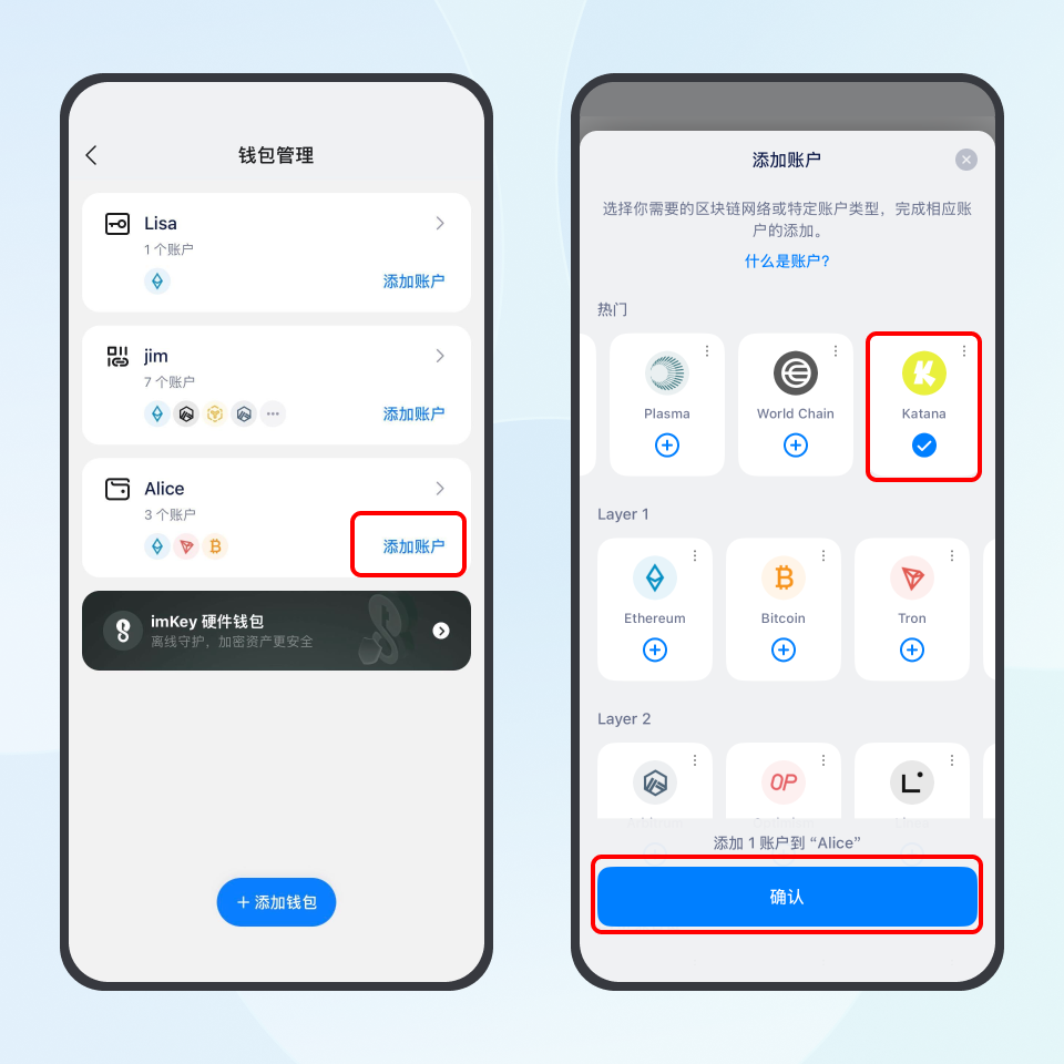 点击「我」-「钱包管理」-「添加账户」,在「热门」栏向左滑勾选 Katana 网络并确认,返回钱包首页即可进入刚创建好的 Katana 账户。