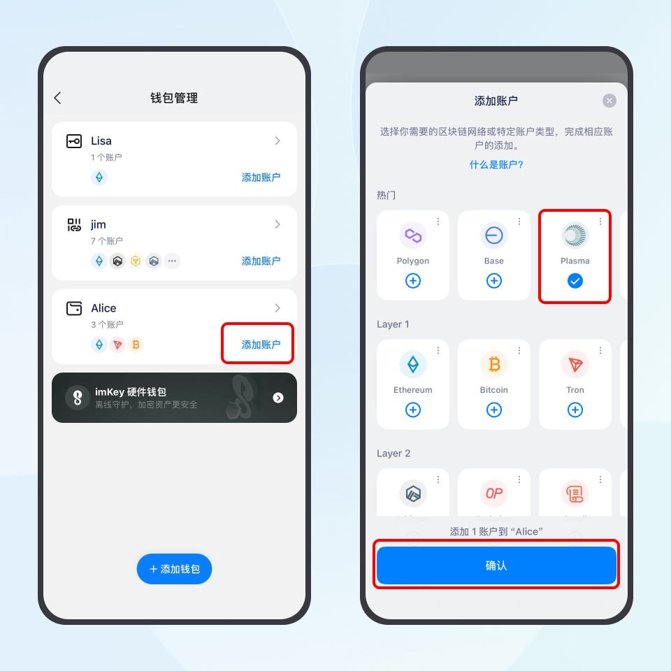 点击「我」-「钱包管理」-「添加账户」,在「热门」栏中勾选 Plasma 网络并确认,返回钱包首页即可进入刚创建好的 Plasma 账户。