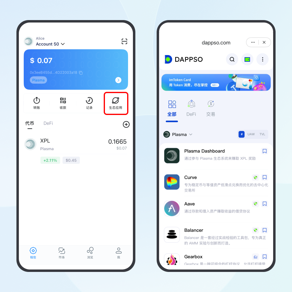 点击 Plasma 账户首页的「生态应用」,即可进行操作并体验其丰富生态 DApp。