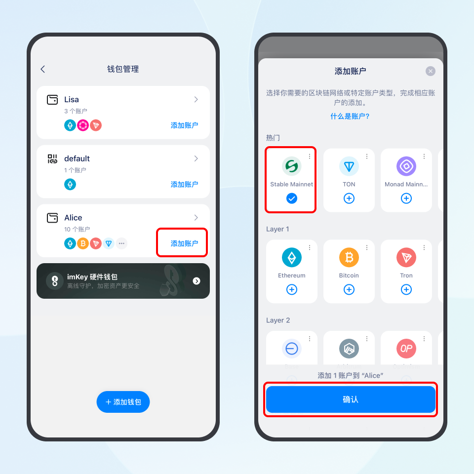 点击「我」-「钱包管理」-「添加账户」,在「热门」栏中勾选 Stable Mainnet 网络并确认,返回钱包首页即可进入刚创建好的 Stable 账户。