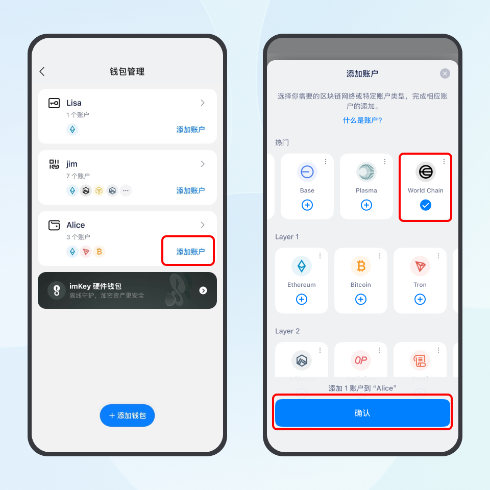 点击「我」-「钱包管理」-「添加账户」,在「热门」栏向左滑,勾选 World Chain 网络并确认,返回钱包首页即可进入刚创建好的 World Chain 账户。